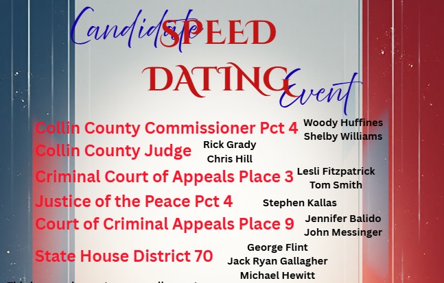 We will have a general meeting and event which will be a primary candidate speed dating event. Our Emcee will be Kathy Ward.